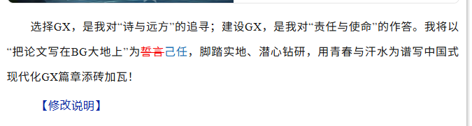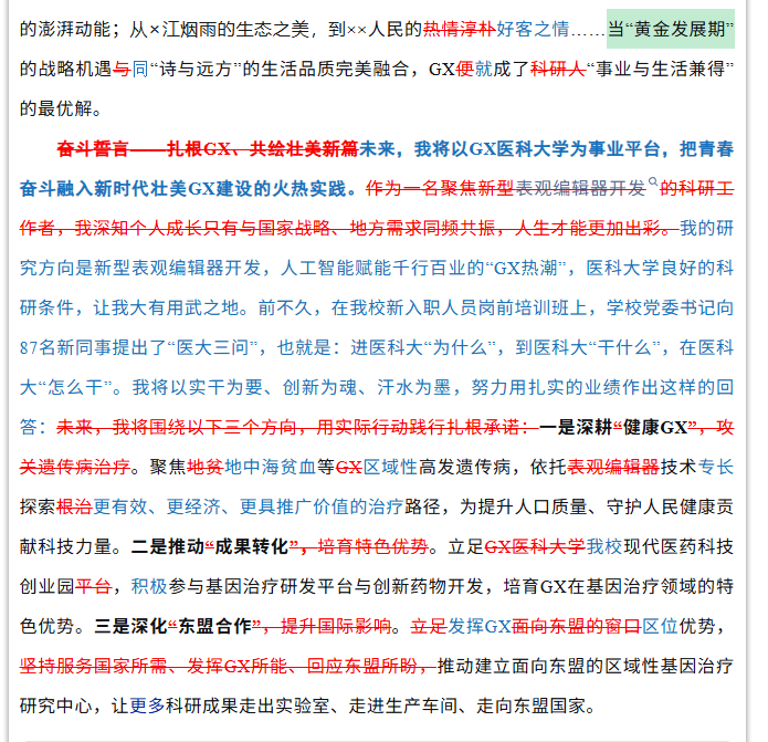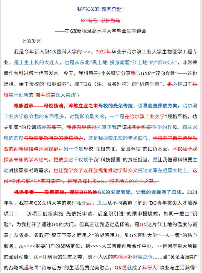 下面是我新近制作的一份三色“花脸稿”。这篇稿子,是我校一名刚入职的博士在全省新招录高水平大学毕业生座谈会上的发言稿。原稿实际上已经修改了五稿,到我手上是第六稿。考虑到这篇稿子挺重要,经我修改形成的稿子也颇具典型性和代表性,我在完成修改后,特意制作成“花脸稿”,并附上简要的修改说明原路返回,供拟稿者对照学习。座谈会召开后数日,主办会议的省委某部负责同志与我偶遇,特地谈到这篇发言稿并给予肯定。